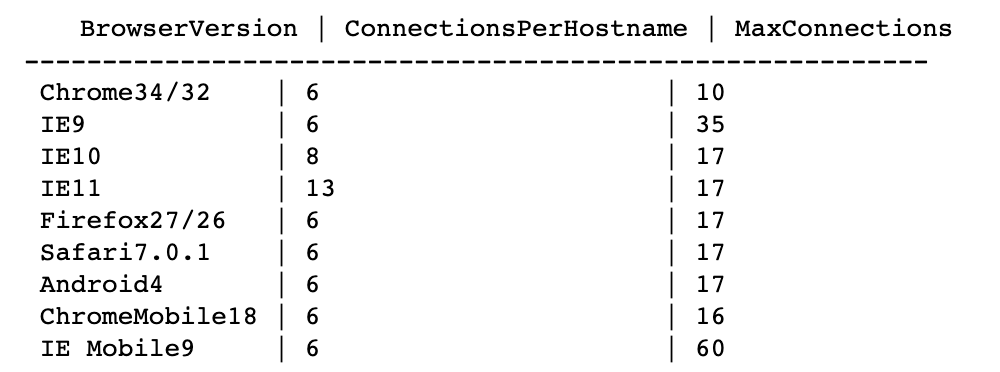 (big-blog.tistory.com/676) 브라우저마다 한번에 동시에 요청할 수 있는 HTTP요청의 제한이 있다고 한다. ConenctionsPerHostname은 한 호스트에 동시에 요청할 수 있는 최대 요청의 제한이고 MaxConnections는 모든 호스트에 동시에 요청할 수 있는 횟수의 제한이다.