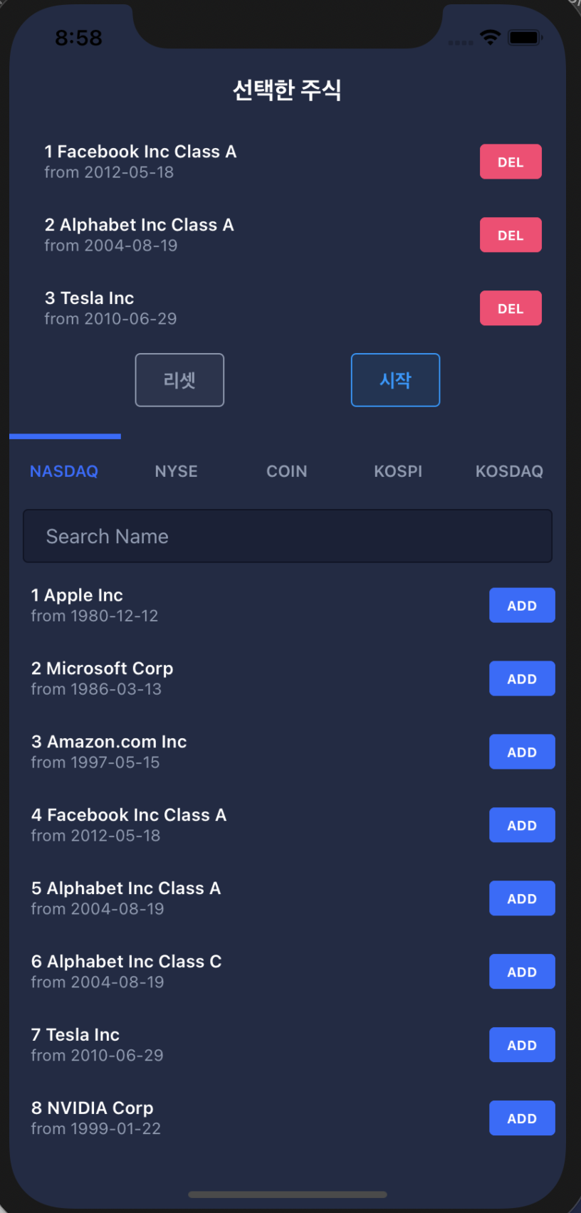 - 주식들이 워낙 많다보니 탭을 바꿀때 1초 이내의 렉이 걸리는데 그냥 넘어가기로 했다. 리스트의 렌더링 자체는 100개정도 단위로 자동으로 끊어져서 부드럽게 나오는 것 같은데 데이터가 바뀔때 초기화 과정에서 시간이 걸리는듯?
